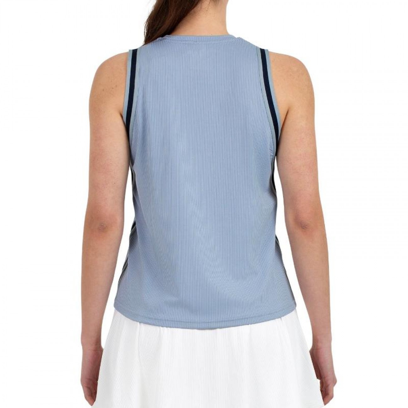 Su estilo limpio, con sisas y laterales decoradas con bandas de raschel y logo bordado, aporta un toque distintivo dentro y fuera de la pista.